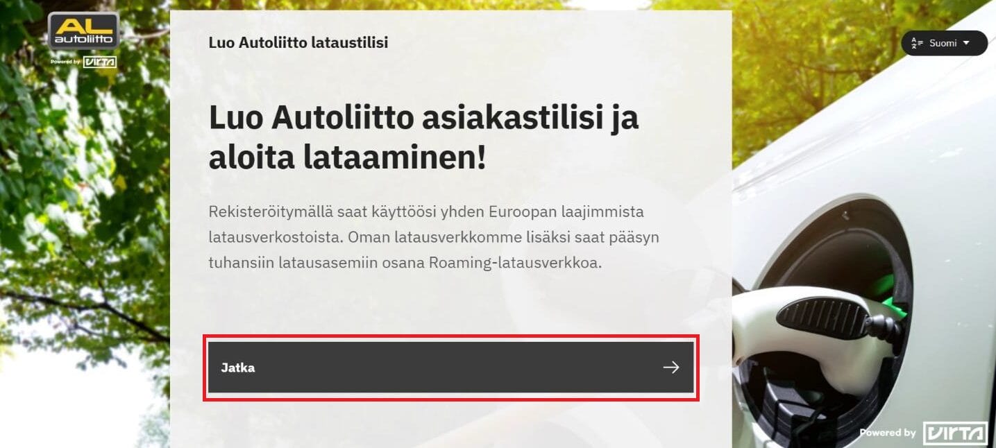 6. Siirryt AL-latauksen asiakkaaksi rekisteröitymiseen (Virran järjestelmään ja Virran asiakaspalvelun piiriin), paina ”Jatka”.