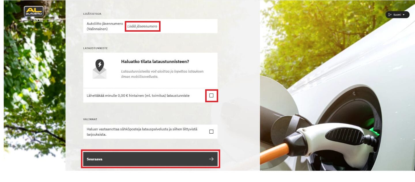 9. Seuraavaksi sinun tulee täyttää Autoliiton jäsennumerosi (löydät sen jäsenkortilta, Autoliiton mobiilisovelluksesta tai www.autoliitto.fi-sivuston kohdasta ”Omat tiedot”). Tässä voit myös tilata veloituksetta käyttöösi Autoliiton lataustunnisteen (ns. RF-ID-tunniste, joka helpottaa asiointia latausasemalla). Jatka painamalla ”Seuraava”.