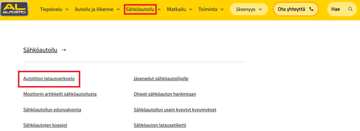 3. Valitse päävalikon keltaisesta palkista ”Sähköautoilu” ja edelleen ”Autoliiton latausverkosto”.