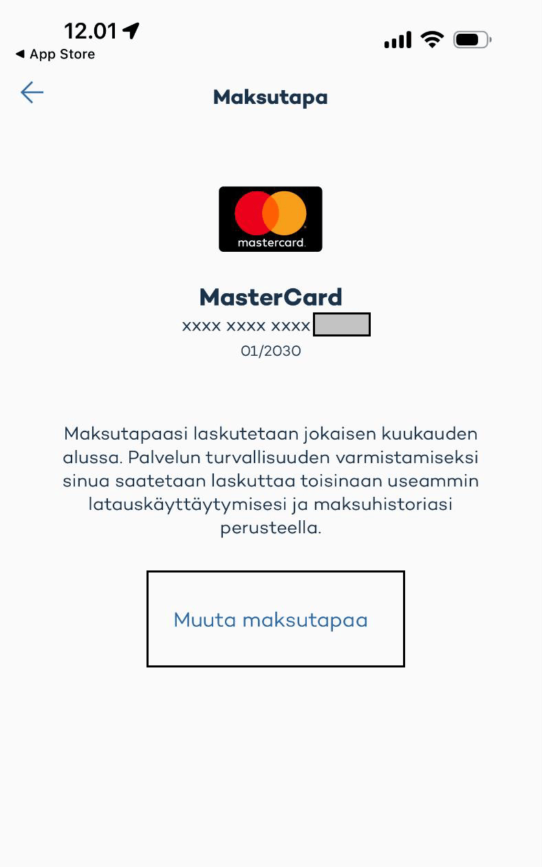 Voit muuttaa tai päivittää asiakkuuteesi liitetyn maksukortin myös mobiilisovelluksesta. Mene kohtaan ”Profiili” ja sitten ”Maksutapa”. Tämän jälkeen näet aktiivisena olevan maksukortin ja voit lisätä uuden kortin valitsemalla ”Muuta maksutapaa”.