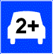 Sininen neliön muotoinen merkki, jossa on kuvattuna auto ja merkintä ”2+” tarkoittaa, että autot, joissa on vähintään 2 matkustajaa, voivat ajaa myös bussikaistalla.