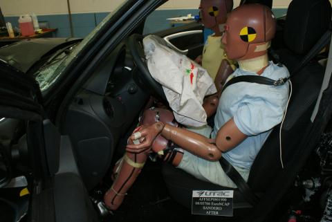 Sandero testattiin ensin ilman sivuturvatyynyjä. Tulos rintakehän loukkaantumisrikin osalta oli heikko. Pylvästestiä ei tehty. Toisessa testissä autossa oli sivuturvatyynyt ja päätä suojaava turvaverho. Nämä molemmat ovat markkina-alueesta riippuen joko vakio- tai lisävaruste. Testitulos parani lantion, keskivartalon – sekä erityisesti rintakehän – osalta. Myös pään suoja arvioitiin hyväksi. Auto sai pylvästestistä täydet pisteet.