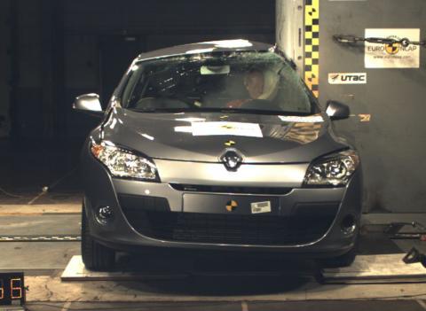 Méganen matkustamon rakenteet säilyttivät törmäyksessä hyvin muotonsa: A-pilari siirtyi taaksepäin vain 10 mm. Auto sai täydet pisteet matkustajien suojasta. Kuljettajan ja etumatkustajan polvien ja reisien suoja oli hyvä. Renault pystyi myös näyttämään, että suoja olisi yhtä hyvä erikokoisille sekä erilaisissa asennoissa istuville matkustajille.