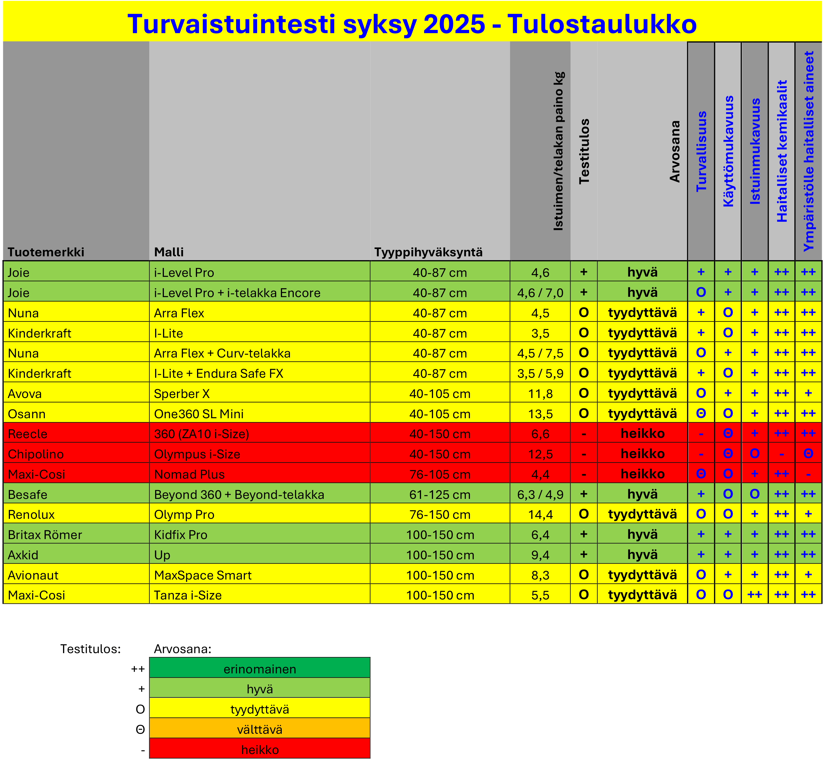 Hyvän kokonaisarvosanan testissä ansaitsivat Joie i-Level Pro -turvakaukalo sekä telakalla että ilman, Besafe Beyond 360 -turvaistuin Beyond -telakalla sekä turvavyöistuimet Britax Römer Kidfix Pro ja Axkid Up.